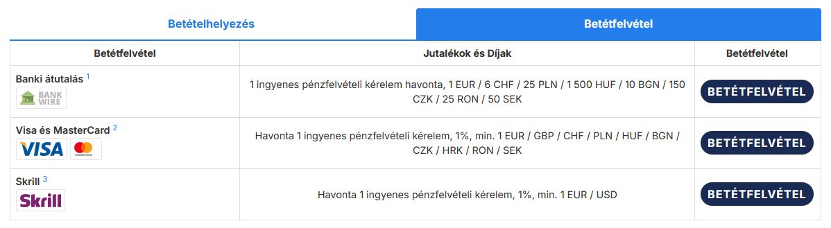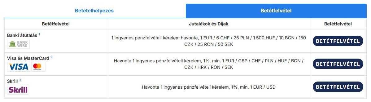 A kereskedési számlára pénz feltöltésére elfogadott fizetési módok a következők: