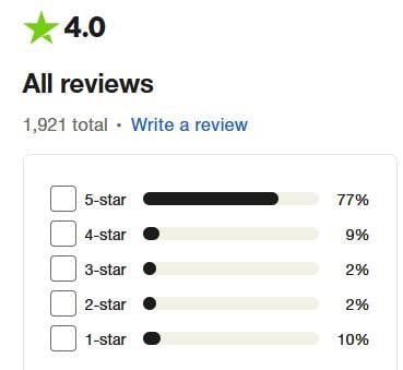 A cég 5-ből 4,0-s értékelésen áll a Trustpilot oldalán több mint 1.900 vélemény alapján.
