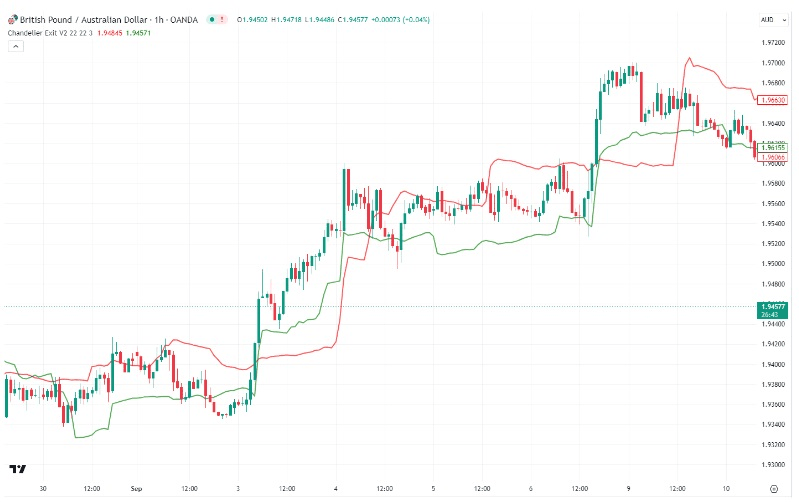 Az alábbi órákra lebontott grafikonon láthatjuk, hogy néz ki a Chandelier Exit a GBP-AUD pár esetében.