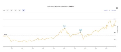 Jelenleg az Egyesült Államok vonatkozásában a mutató körülbelül 200%-on áll (ami azt jelenti, hogy az amerikai részvénypiac kétszer akkora, mint az ország gazdasága) – ez alapján arra a megállapításra juthatunk, hogy az amerikai tőzsde nagyon túlértékelt