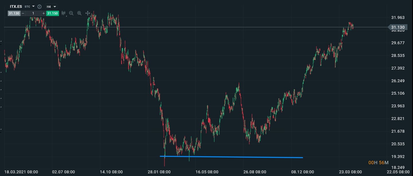 A kettős alj egy csökkenő trendből származik, de olyan alakzat, ami emelkedésre utal. Két mélypontból áll, amelyek jelzik ezt a trendfordulót és áttörik az ellenállást. Különösen jó lehetőség, amikor a második mélypont kicsit mélyebbre esik, mint az első. Az erős kezek kihasználják az első ütést, hogy amikor úgy tűnik, az ár emelkedni fog, hirtelen eladjanak - ezzel mélyebbre lökve az árfolyamot. A többiek stop loss megbízásai aktiválódnak, ekkor ezek a cápák elkezdenek vásárolni, ami aztán az árfolyamot visszafordíthatatlanul emelkedésre készteti.