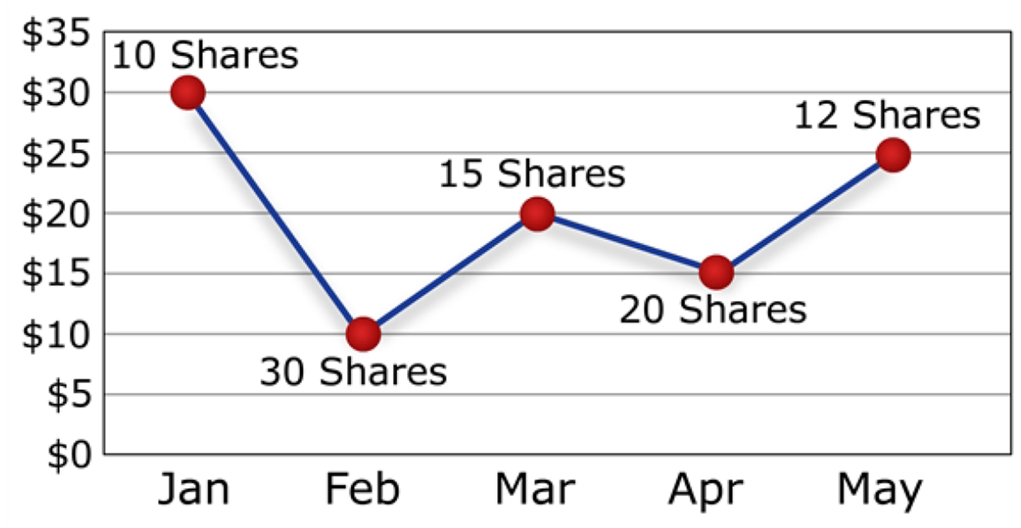 Ahogy a korábbi példában láttuk, ha az egész időszakot tekintjük, a DCA módszer hatékony volt. Azonban még ideálisabb lett volna, ha a 3. hónapban fektettünk volna be, amikor a részvények olcsóbbak voltak. Így még több részvényt szereztünk volna a dollár költségátlagolás módszerével.