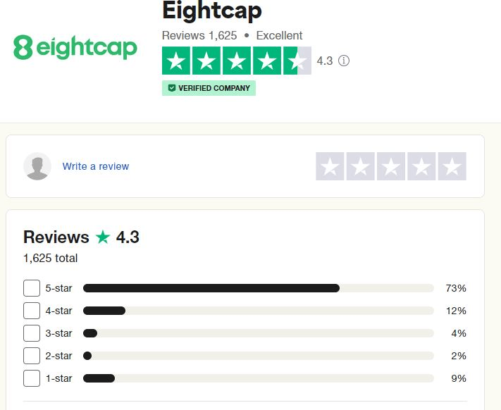 Elemzést végeztünk a felhasználók véleményeiről az Eightcap platformmal kapcsolatban, és ezek kétségtelenül pozitívak, 4,3 / 5 TrustPilot pontszámmal.