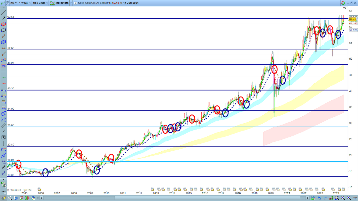 Itt van például a Coca Cola negyedéves grafikonja. Nincs más teendő, csak hagyni, hogy a vállalat működjön. Nagyon stabil részvény, amelynek árfolyama az elmúlt 20 évben 13,35-ről 62,50-re emelkedett - vagyis majdnem 5-szörösére, ráadásul nagyon stabil osztalékokkal. Ennek eredménye a magas összetett hozam.