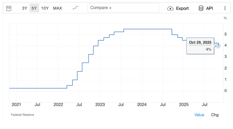 A Federal Reserve 25 bázisponttal csökkentette az irányadó kamatot, ezzel 4%–4,25% közötti sávba helyezve azt, ami Az Egyesült Államok jegybankja ismét 25 bázisponttal csökkentette az irányadó kamatlábat, így az új sáv 3,75%–4%.