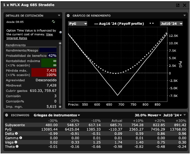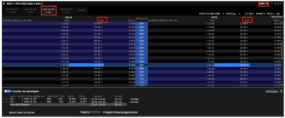 Megnyitjuk a stratégia készítőt és vásárolunk (BID oszlop) egy ATM PUT-ot és egy CALL-t, ebben a pillanatban a Netflix árfolyama 685,75. A stratégia költsége a 2 prémium összege: 7.425$, ami megegyezik a maximális lehetséges veszteséggel.