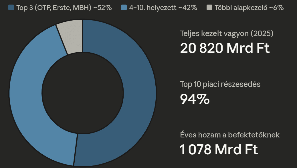 A piac koncentrációja tovább nőtt: a tíz legnagyobb alapkezelő a teljes piaci vagyon mintegy 94 százalékát kezeli, élükön az OTP, az Erste és az MBH alapkezelőivel. Ez egyrészt stabilitást ad a szektornak, másrészt kihívást jelent a kisebb, de gyakran innovatívabb szereplők számára.