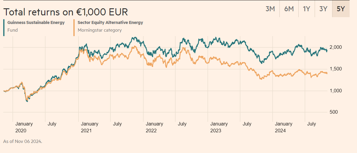 A Guinness Sustainable Energy alap olyan vállalatokba fektet be a fenntartható energia iparágában, amelyek nem igényelnek fosszilis tüzelőanyagokat, mint például a kőolaj vagy a szén. Ezenkívül hozzájárulnak a globális dekarbonizációhoz, fenntartható befektetési célokkal és jó kormányzási gyakorlatokkal.