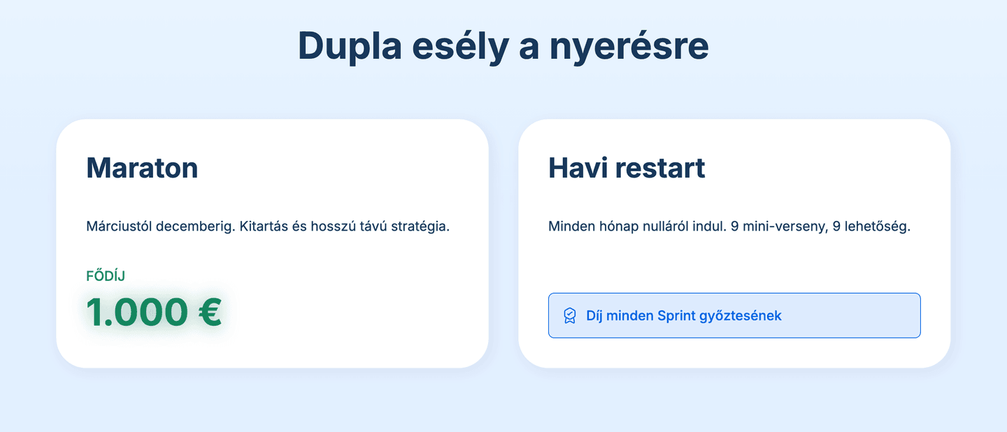 A cél nem az, hogy „fogadjunk” vagy agresszíven kereskedjünk, hanem hogy bizonyítsd: képes vagy hosszú távon következetesen kezelni egy portfóliót. Ezért nemcsak a hozamot, hanem a kockázatkezelést és a stratégia stabilitását is értékelik.