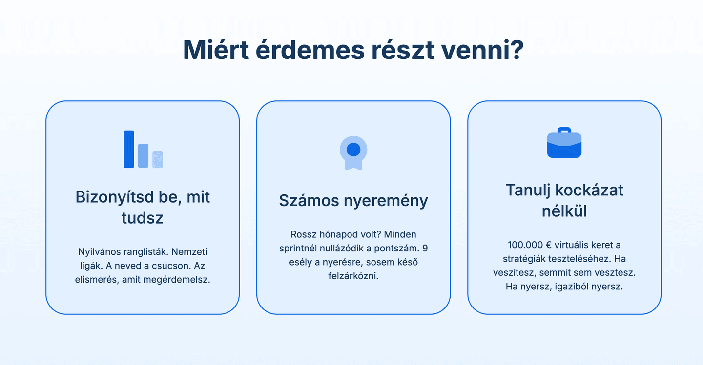 Mert a valós befektetési logikát követi, de pénzügyi kockázat nélkül. A verseny a fegyelmet, a tervezést és a következetességet jutalmazza.