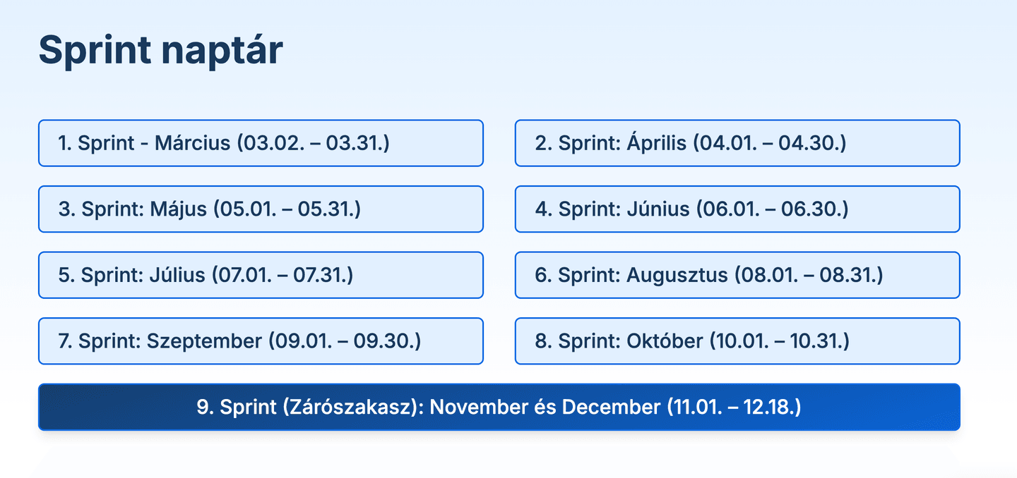Összesen 9 havi sprint zajlik márciustól decemberig.