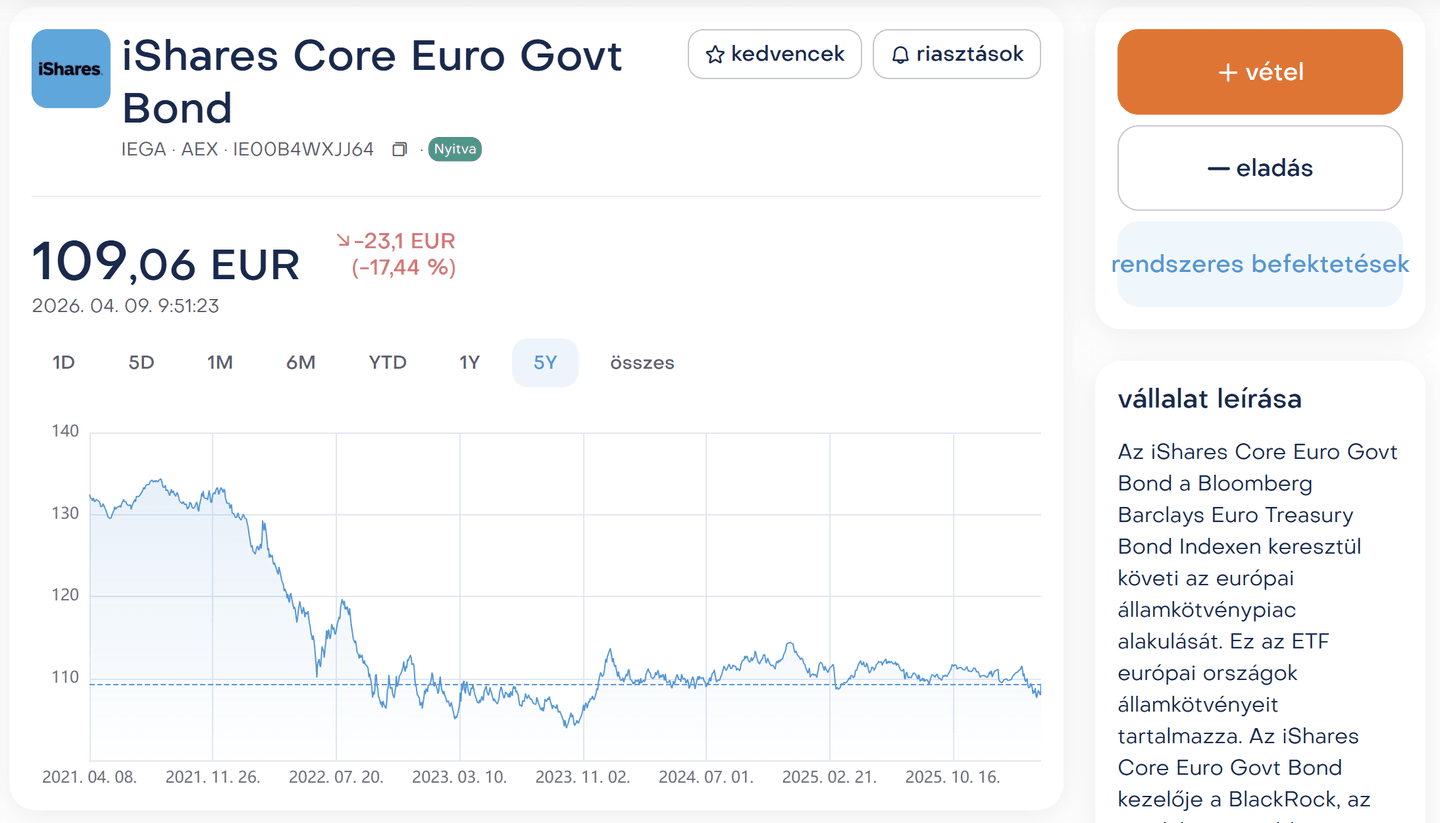 - 40-50%: iShares Euro Government Bond vagy Vanguard Euro Treasury ETF (kötvény).