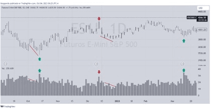 Ahogy láthatod, a szokatlan volumenek segítenek előre jelezni, hogy talán véget érhet egy mozgás. A nagy kereskedők úgy gondolják, hogy ez jó pillanat lehet a vásárláshoz vagy eladáshoz. Néha ez rövid idő alatt következik be, ám leggyakrabban egy hosszú és összetett folyamatról van szó, amelyben remekül észlelhetjük az erők kimerülését az egyik vagy másik irányba, és megpróbálhatunk bekapcsolódni abba az irányba, amelyet a legvalószínűbbnek tartunk.