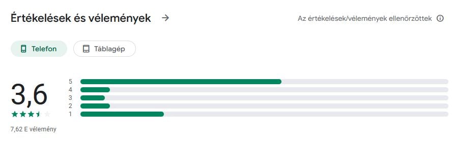 Ha ellátogatunk a Google Play Áruházba, láthatjuk, hogy az Android alkalmazás értékeléseinek átlaga is hasonló (bár valamivel alacsonyabb):
